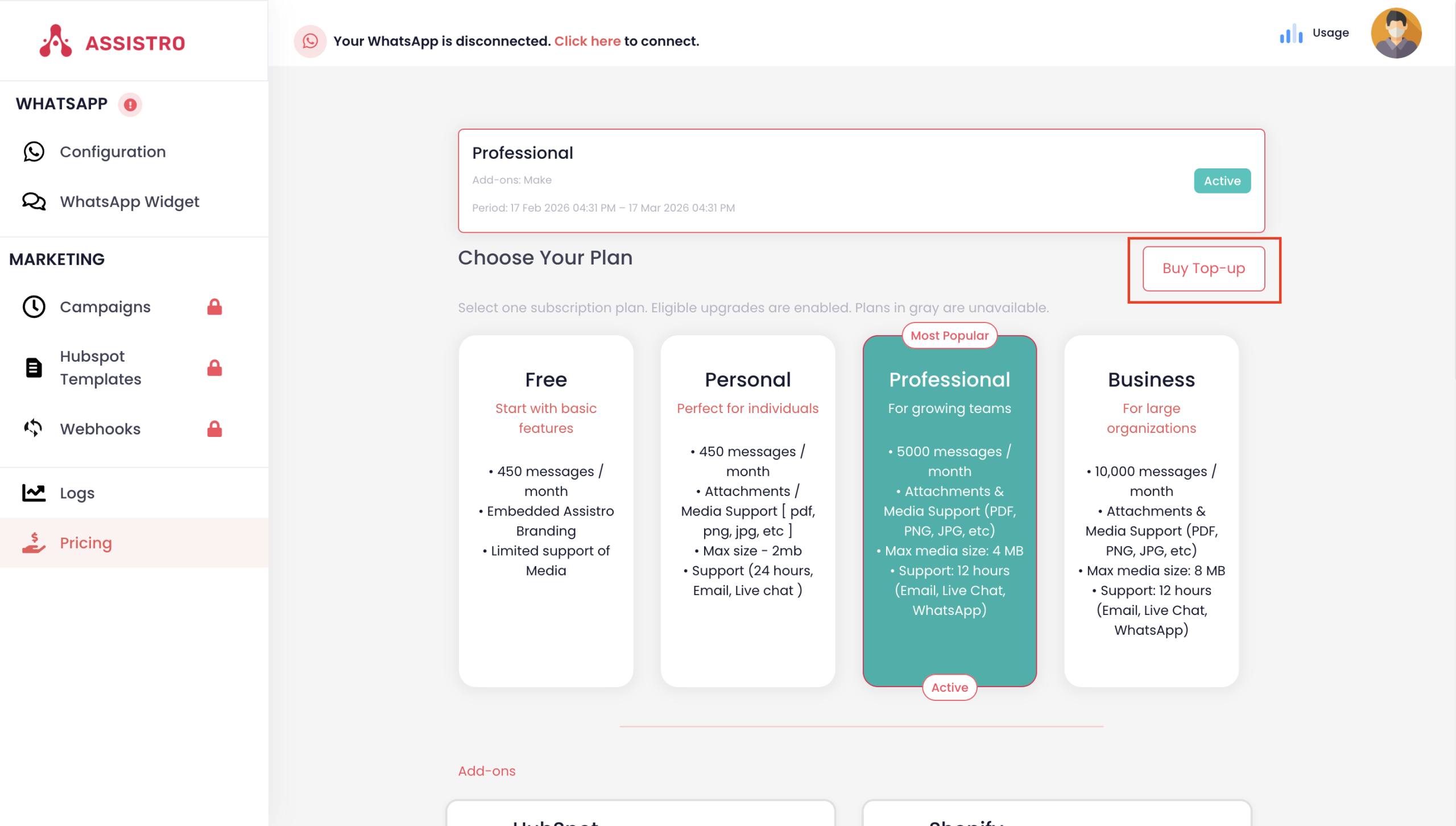 If you have hit your monthly or daily message limit but don’t want to upgrade to a higher recurring tier, you can buy a one-time “Top Up“:
