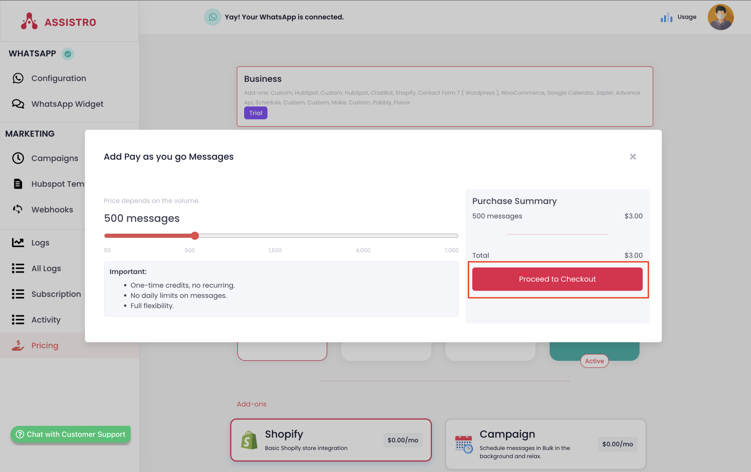 3.). Select the amount of the messages and click Proceed to Checkout.