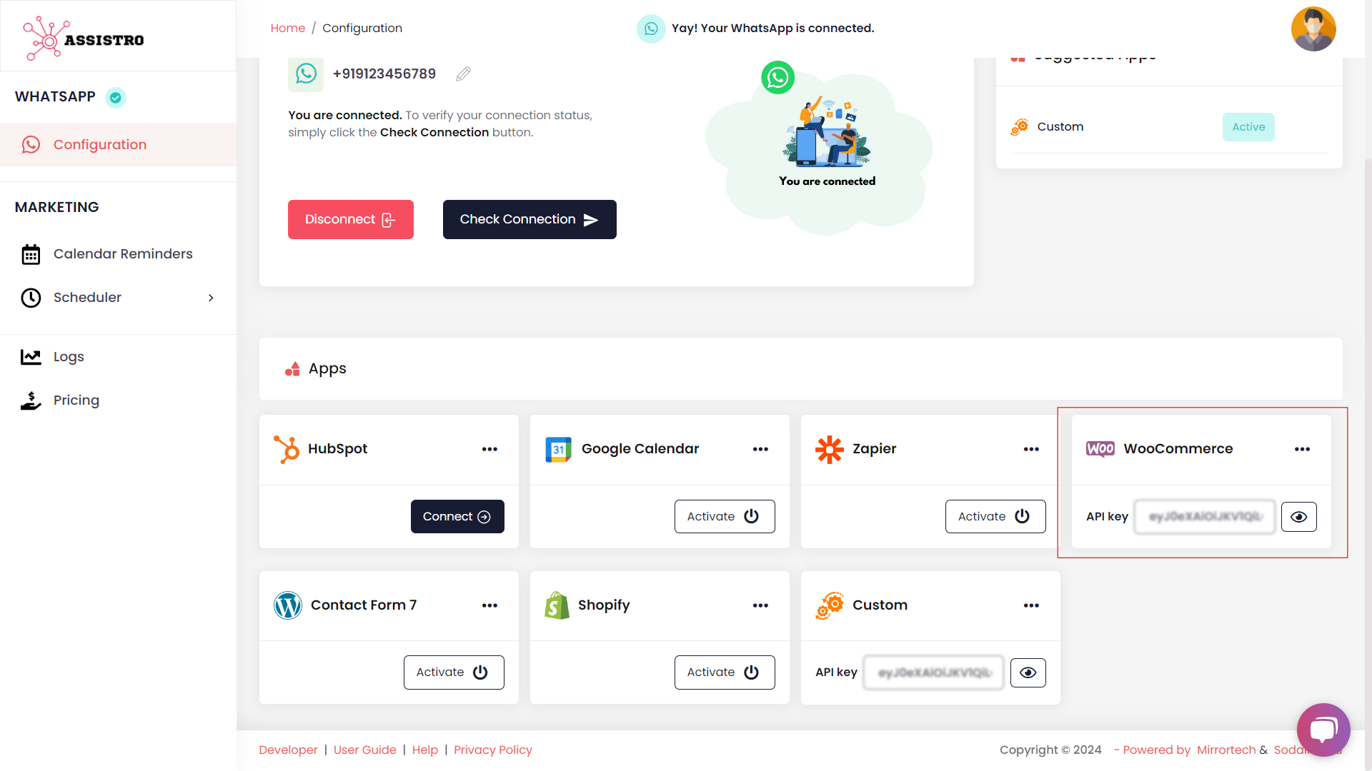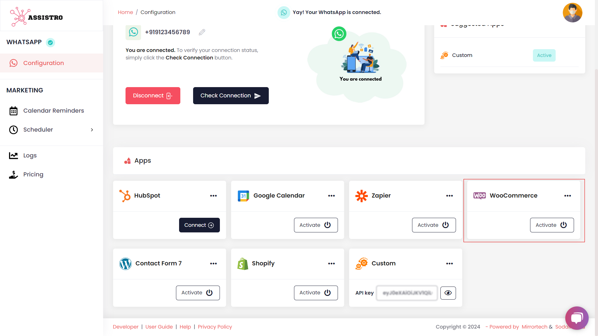Once installed, you will see Assistro in the Woocommerce tab in navigation bar, click on Assistro, select WAPushPlus and setup your plugin with the required credentials and enable the toggle button to activate the plugin.