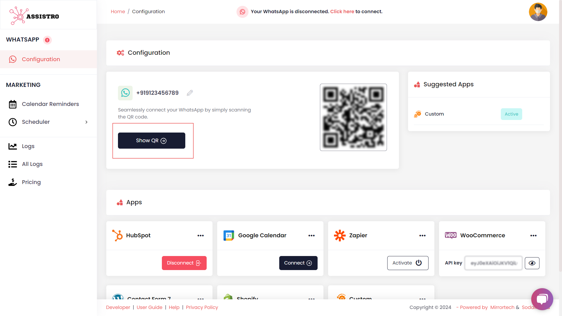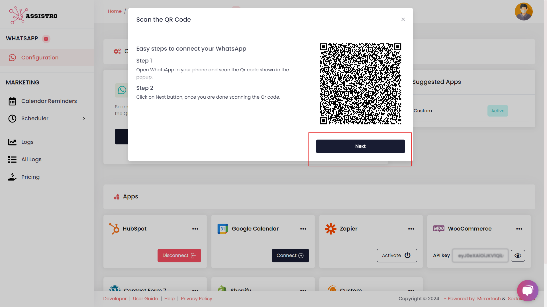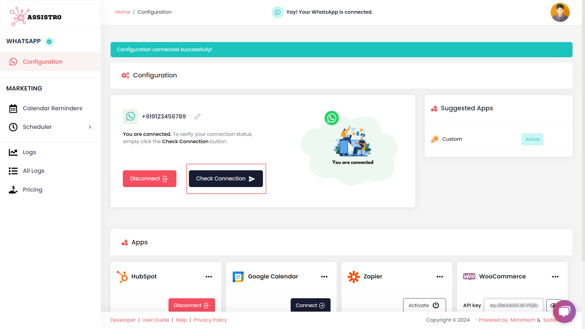 Once you are logged in, you will be redirected to WhatsApp Configuration page.