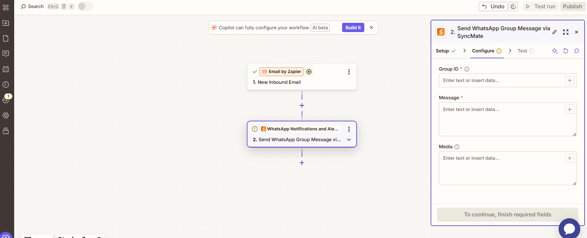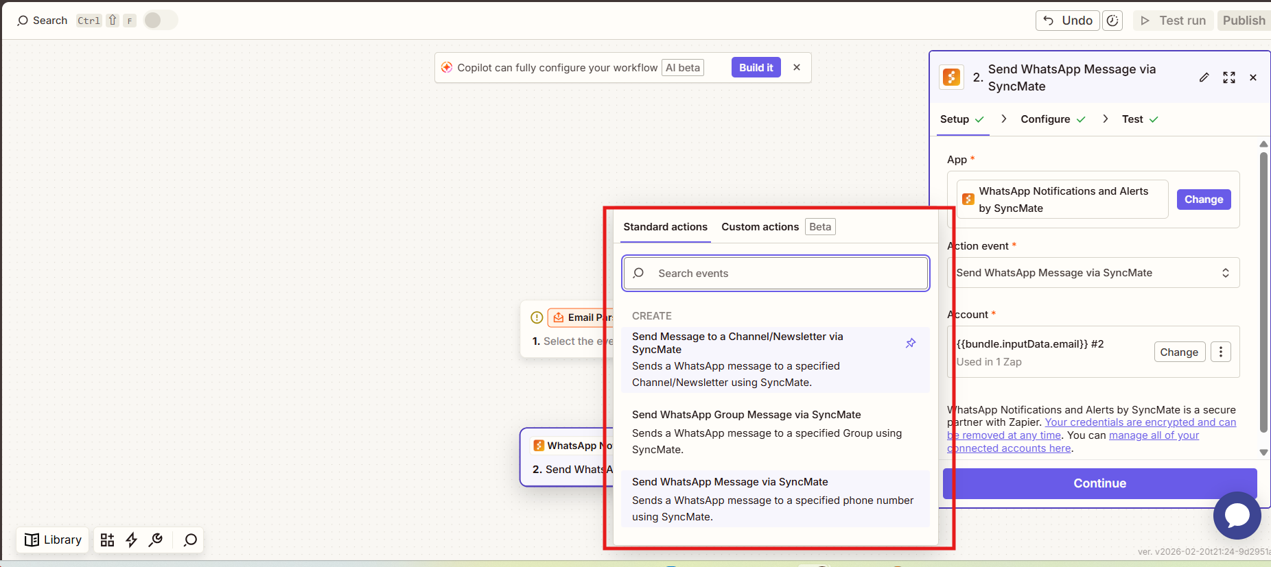 - For sending a notification to any group: “Send WhatsApp Group Message via SyncMate”