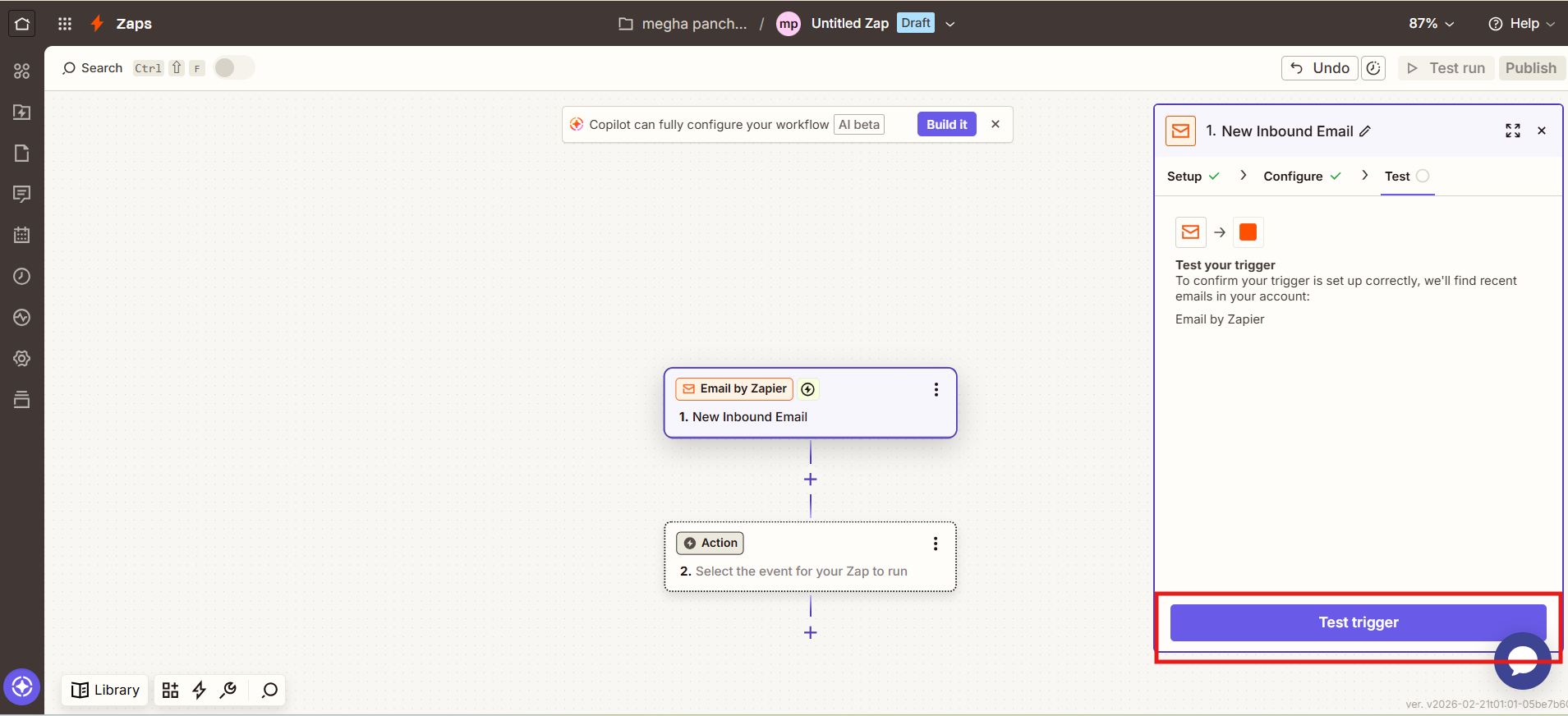 Now, by clicking “Test trigger”, test the trigger you have created. Then, click “continue with selected record”.